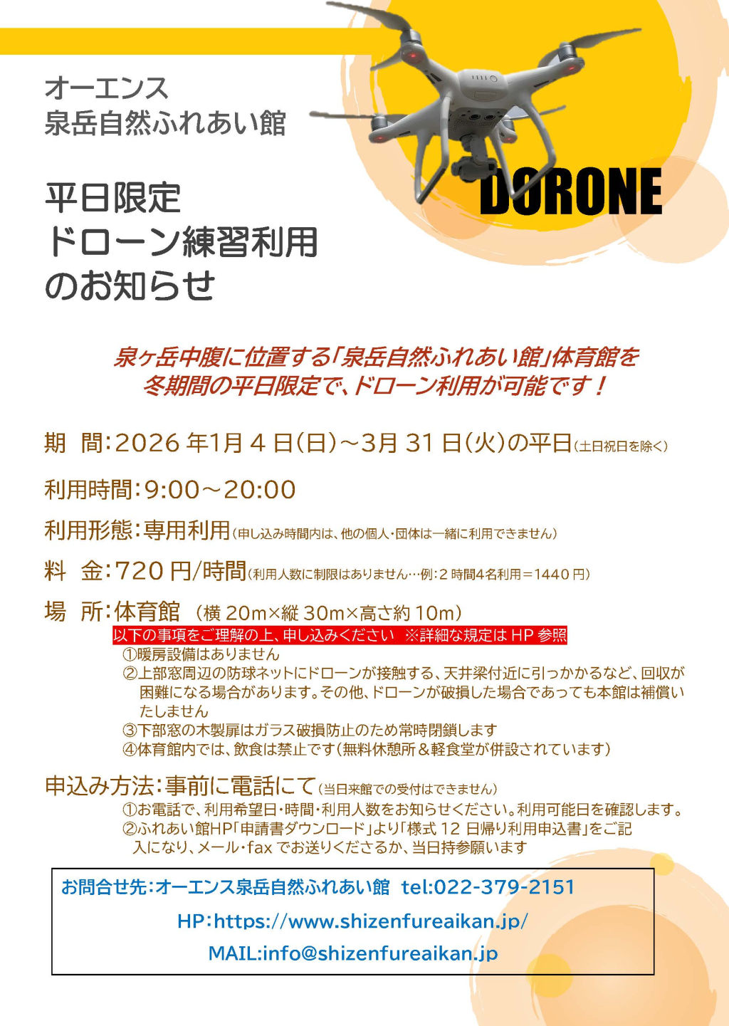 2026年1月4日(日)~3月31日(火)の平日限定で、体育館をドローン練習用に開放いたします。申し込みは、事前に電話を頂き、空き状況を確認した後利用が可能です。詳しい利用方法等は、「無人航空機(ドローン等)利用に係る遵守事項等」をご覧ください。
